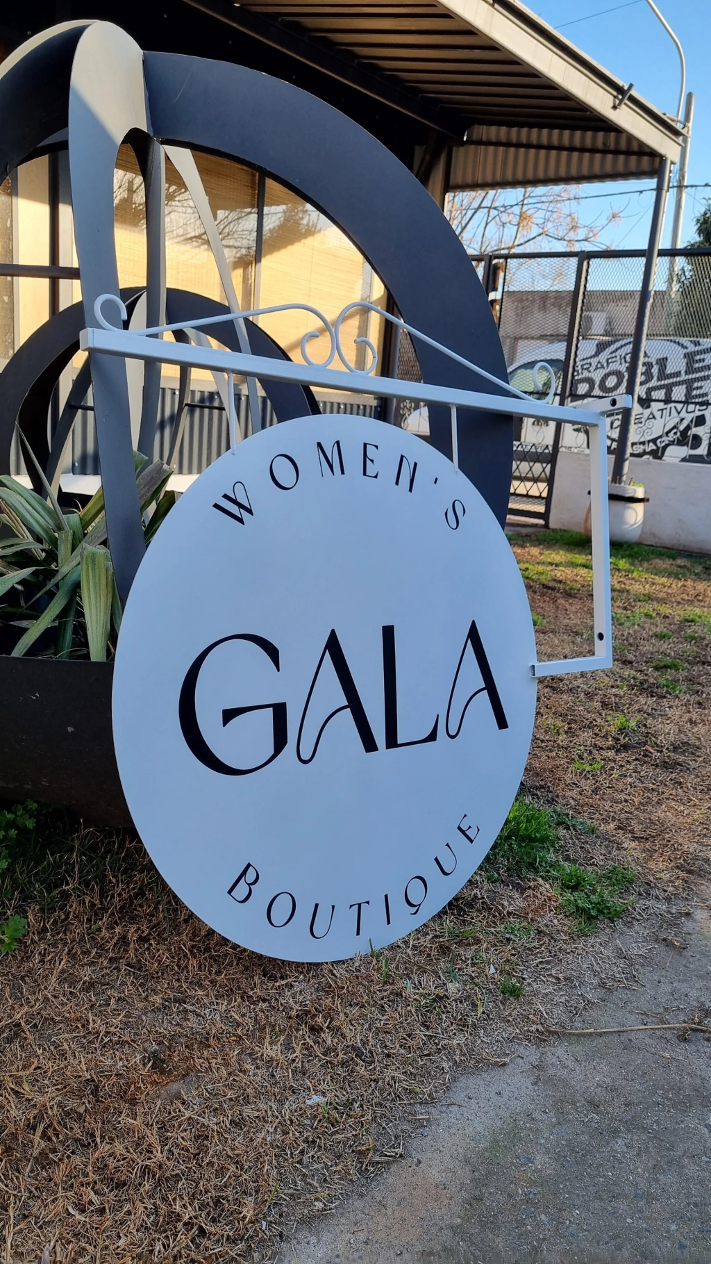 Banderola de chapa y hierro, de estructura resistente y elegante, ideal para señalización comercial o decorativa. Este modelo presenta una base de hierro robusta que le proporciona estabilidad y durabilidad.